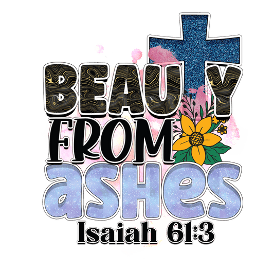 This vibrant design features the uplifting phrase "Beauty from Ashes" alongside floral elements and a cross, inspired by Isaiah 61:3.DTF Transfers