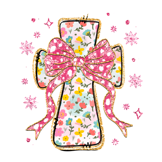 A whimsical flower-patterned cross adorned with a large pink polka-dot bow, surrounded by sparkling accents for a festive touch.DTF Transfersdtf regular iron