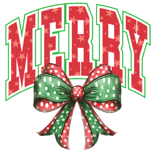 A festive design featuring the word "MERRY" in red with star patterns, topped with a green and red polka-dotted bow. heat press transfers