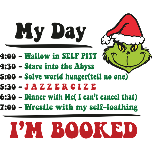 Regular price From £0.75 GBPRegular priceUnit price / per£2.40 GBPSale price From £0.75 GBPA humorous daily schedule featuring the Grinch, highlighting whimsical activities like "JAZZERCISE" and "Dinner with Me."DTF Transfersdtf regular iron dtf prints