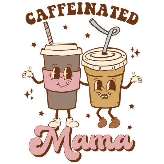 A playful design featuring two animated coffee cups with smiles, showcasing the phrase "Caffeinated Mama" in a fun, colorful style.dtf regular iron