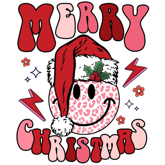 A cheerful Christmas design featuring a smiling leopard-print face wearing a festive Santa hat, surrounded by colorful lettering and decorations. dtf prints