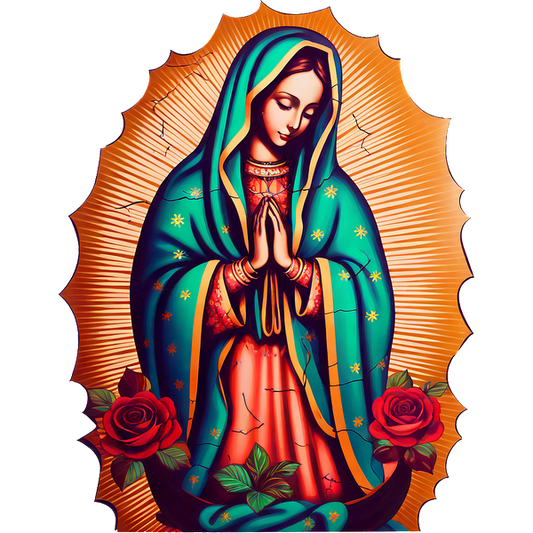Regular price From £0.75 GBPRegular priceUnit price / per£2.40 GBPSale price From £0.75 GBPA vibrant depiction of the Virgin Mary, adorned with turquoise and red robes, surrounded by roses and radiant golden rays. heat press transfers