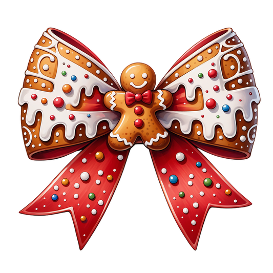 A festive gingerbread bow featuring colorful icing, sprinkles, and a cheerful gingerbread man centerpiece, perfect for the holidays! heat press transfers