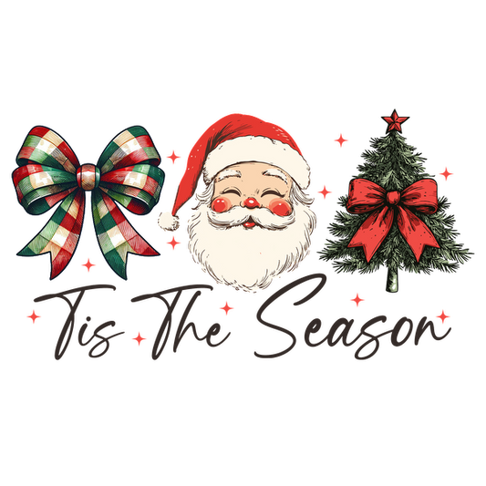 A festive illustration featuring Santa Claus, a Christmas tree, and plaid bows, accompanied by the phrase “'Tis The Season.”dtf regular iron