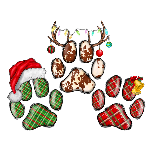 Festive paw prints adorned with a Santa hat, plaid patterns, and holiday decorations, perfect for celebrating the Christmas spirit!DTF Transfers dtf prints