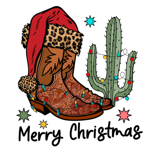 Festive cowboy boots adorned with lights, a cheetah-print Santa hat, and a cheerful cactus create a whimsical holiday vibe. dtf prints