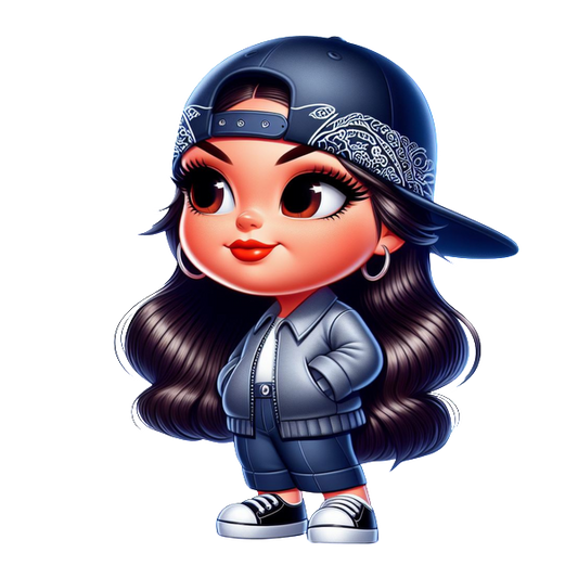 A cute cartoon girl with long wavy hair, wearing a stylish oversized jacket, hat, and casual pants. heat press transfers