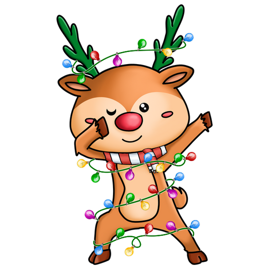 Regular price From £0.75 GBPRegular priceUnit price / per£2.39 GBPSale price From £0.75 GBPA cheerful cartoon reindeer wrapped in colorful Christmas lights, wearing a festive scarf and playfully posing with a wink. dtf prints