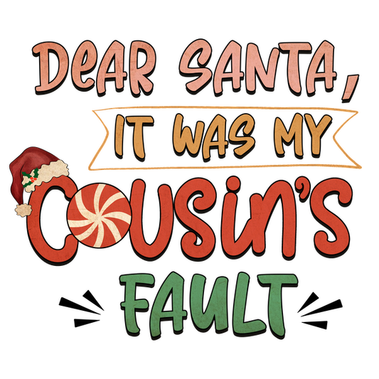 A playful and festive design that humorously attributes holiday mischief to a cousin, perfect for Christmas spirit!dtf regular iron