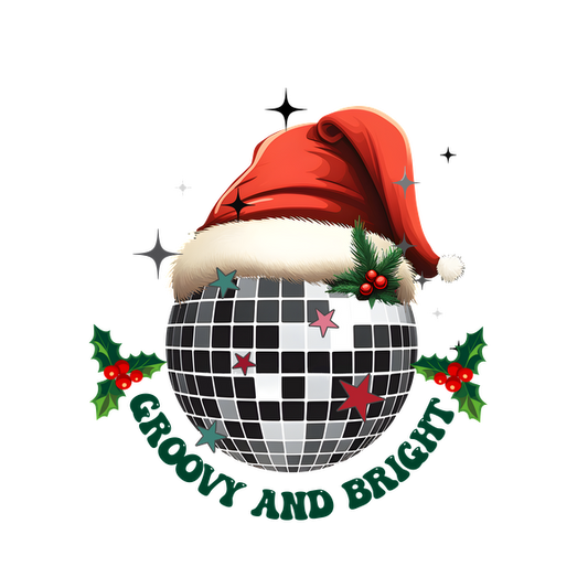 A festive disco ball wearing a Santa hat, adorned with holly leaves and the phrase "Groovy and Bright."dtf regular iron