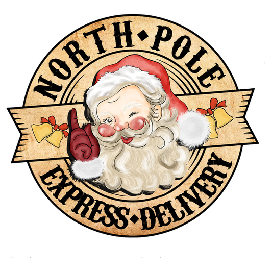 Regular price From £0.75 GBPRegular priceUnit price / per£2.39 GBPSale price From £0.75 GBPA whimsical logo featuring Santa Claus with a playful expression, marked "North Pole Express Delivery," adorned with bells and festive colors. dtf transfers