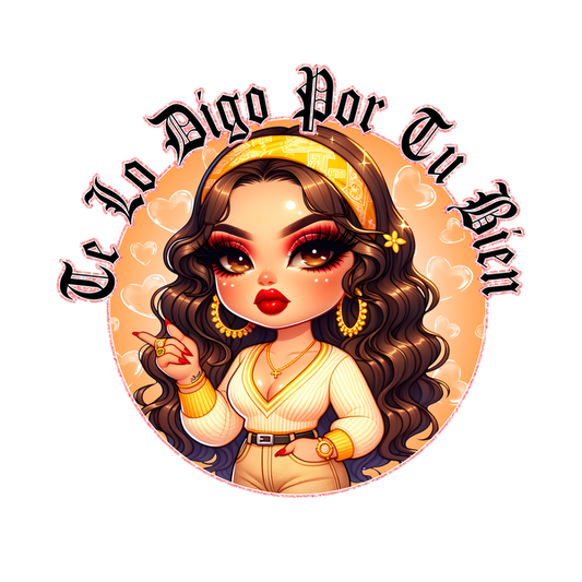 A vibrant illustration of a stylish woman with long wavy hair, wearing a chic outfit, adorned with the phrase "Te Lo Digo Por Tu Bien." dtf prints