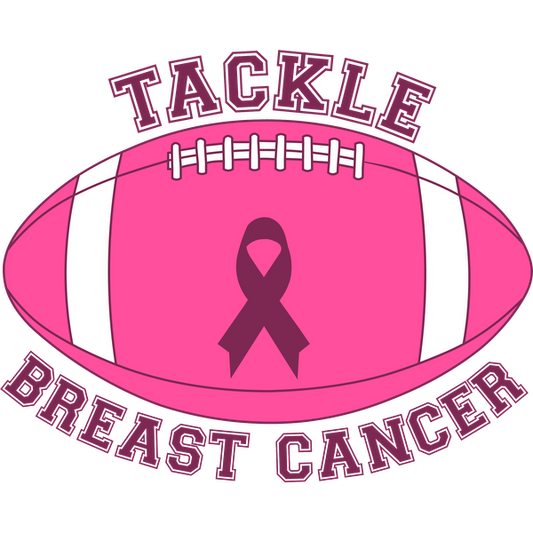 A vibrant pink football design featuring the phrase "Tackle Breast Cancer" alongside a breast cancer awareness ribbon. dtf transfers