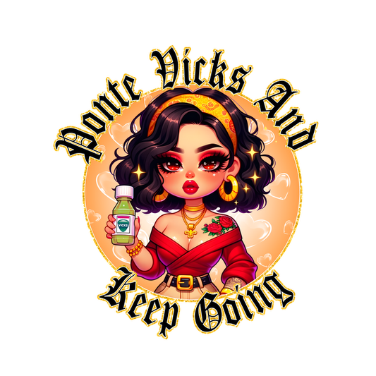 A vibrant illustration featuring a stylish character holding a green beverage, surrounded by the phrase "Ponte Vicks And Keep Going."dtf regular iron