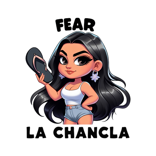 A playful cartoon character confidently holds a flip-flop, embodying the humorous phrase "Fear La Chancla." dtf transfers