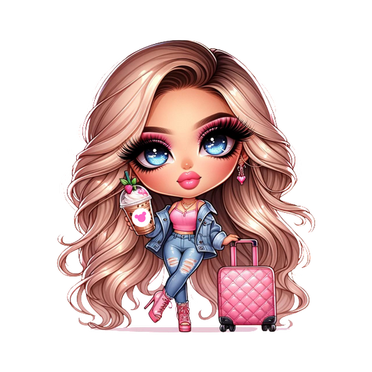 A stylish cartoon girl with long blond hair holds a drink, dressed in a denim outfit, and pulling a pink suitcase. heat press transfers