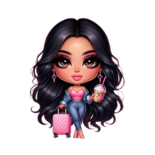 Regular price From £0.75 GBPRegular priceUnit price / per£2.39 GBPSale price From £0.75 GBPThis cute cartoon character features long black hair, stylish denim attire, and holds a pink suitcase and a milkshake.