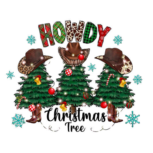 Festive holiday design featuring three decorated Christmas trees wearing cowboy hats, surrounded by snowflakes and cheerful "Howdy Christmas" text.DTF Transfersdtf regular iron dtf prints