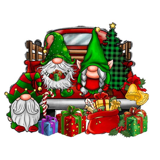 A festive illustration featuring whimsical Christmas gnomes, festive gifts, a decorated tree, and holiday decorations, perfect for seasonal cheer.DTF Transfers heat press transfersdtf regular iron