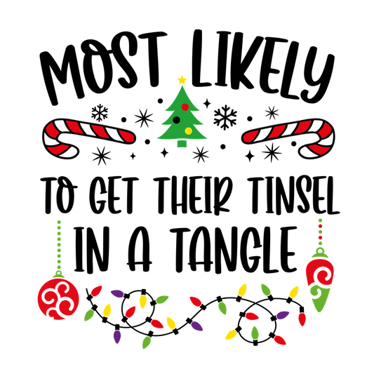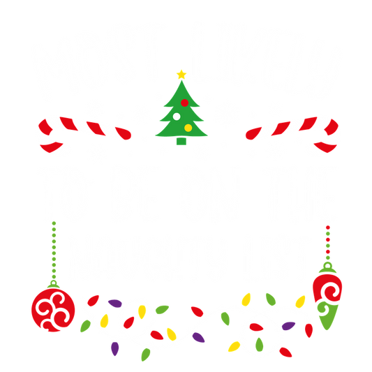 Fun holiday graphic featuring the phrase "Most Likely to Be on the Naughty List," surrounded by festive elements like candy canes and Christmas lights.DTF Transfersdtf regular irondtf regular iron