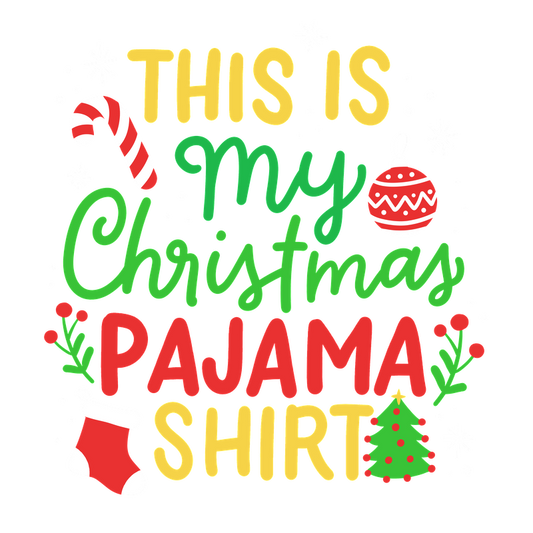 A festive "My Christmas Pajama Shirt" design featuring colorful text, candy canes, ornaments, and holiday floral accents.DTF Transfers dtf prints