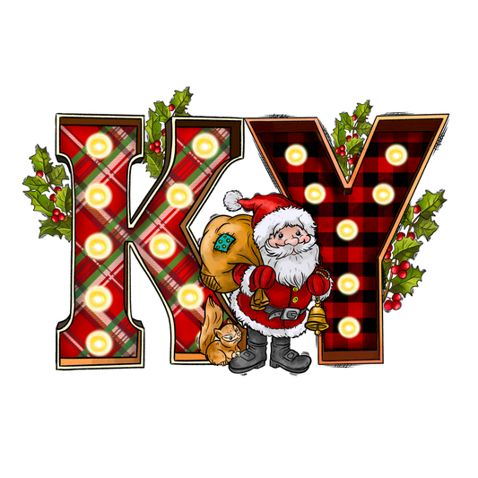 A festive design featuring "KY" in plaid patterns, adorned with holly, and a cheerful Santa holding a sack and a cat.DTF Transfers heat press transfersdtf regular iron