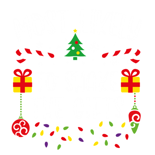 Regular price From £0.75 GBPRegular priceUnit price / per£2.39 GBPSale price From £0.75 GBPA festive design featuring the phrase "Most Likely to Shake the Gifts" surrounded by candy canes, gifts, and holiday decorations.DTF Transfers heat press transfers dtf prints
