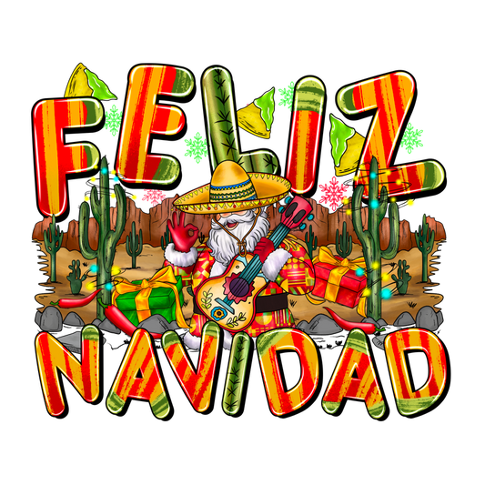 Celebrate the holidays with this vibrant “Feliz Navidad” design featuring a festive character in a sombrero, surrounded by cacti and gifts!DTF Transfers dtf transfers dtf transfers