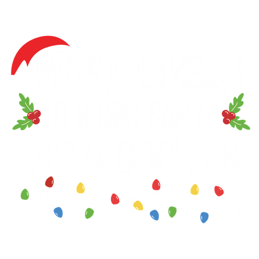 Festive design featuring the playful phrase "Most Likely to Bribe Santa with Cookies," adorned with holly and colorful lights.DTF Transfers dtf prints