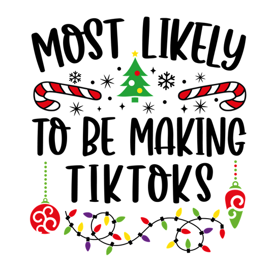 A festive design featuring bold text proclaiming "Most Likely to Do All the Christmas Baking," surrounded by colorful holiday decorations.DTF Transfers dtf transfersdtf regular iron