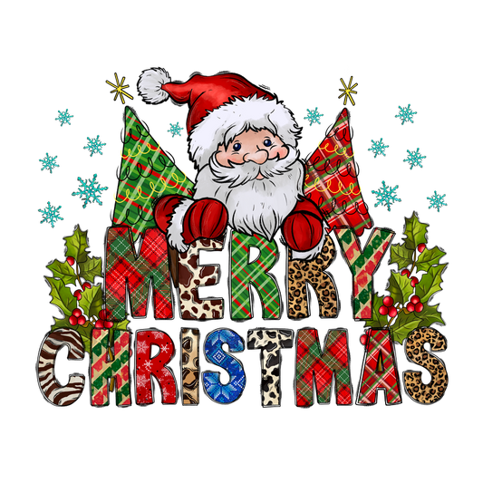 Celebrate the festive season with this cheerful Santa-themed "Merry Christmas" design, adorned with colorful patterns and snowflakes.DTF Transfers dtf transfersdtf regular iron