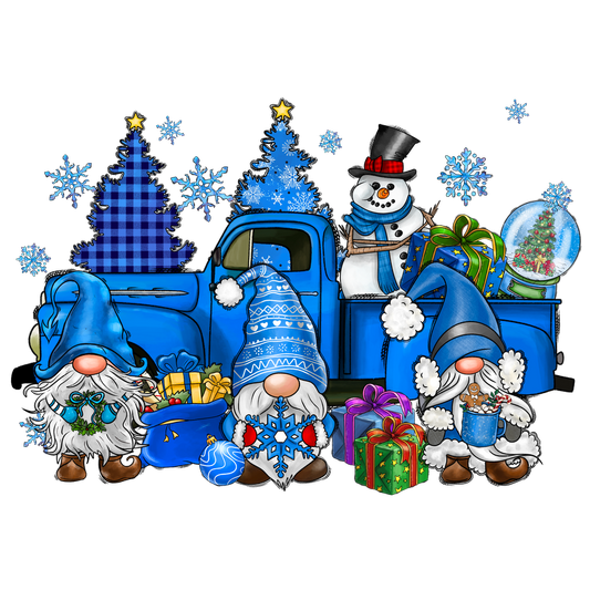 A festive scene featuring cheerful gnomes, a blue vintage truck, and whimsical decorations including gifts, a snowman, and Christmas trees.DTF Transfers dtf transfers