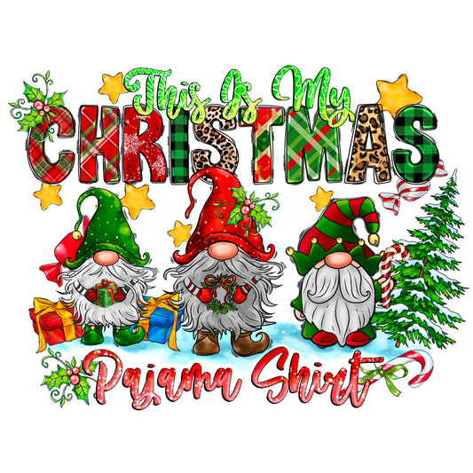 Festive and fun, this "This Is My Christmas Pajama Shirt" features adorable gnomes, colorful gifts, and cheerful holiday elements.DTF Transfersdtf regular iron