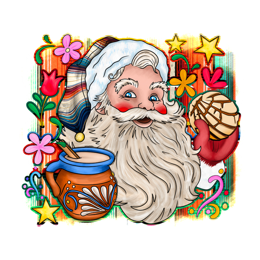 A festive illustration featuring Santa with a colorful background, surrounded by flowers, a traditional pot, and a concha pastry.DTF Transfers heat press transfers