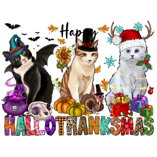 A whimsical illustration featuring three cats dressed in festive attire, celebrating a blend of Halloween, Thanksgiving, and Christmas themes.DTF Transfers dtf prints