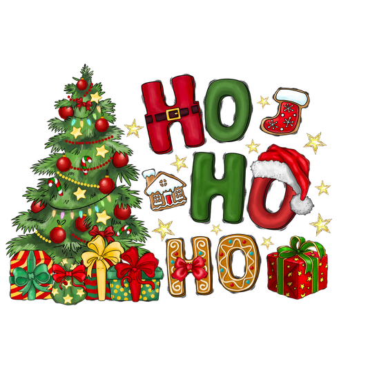 A festive illustration featuring a decorated Christmas tree, colorful gifts, and playful "HO HO HO" letters with holiday accents.DTF Transfers dtf prints
