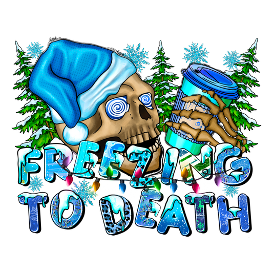 This festive graphic features a playful skull wearing a blue Santa hat, with icy text reading "FREEZING TO DEATH" amidst wintery elements.DTF Transfers