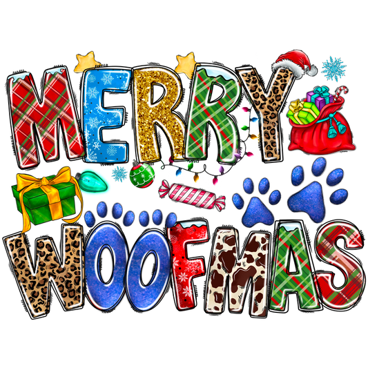 Celebrate the festive season with this colorful "Merry Woofmas" design featuring playful lettering and fun holiday icons!DTF Transfers heat press transfers