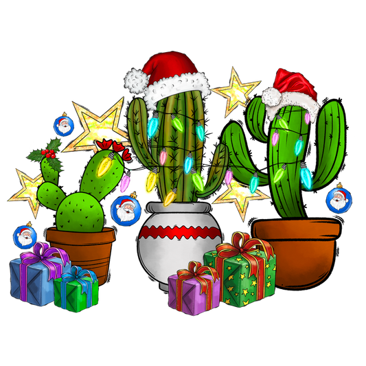 Festively decorated cacti wear Santa hats and are adorned with colorful lights, surrounded by Christmas gifts and bright stars.DTF Transfersdtf regular iron