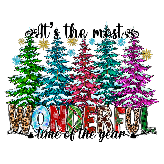 A colorful winter-themed design featuring vibrant trees and the cheerful phrase "It's the most WONDERFUL time of the year."DTF Transfersdtf regular iron dtf transfers
