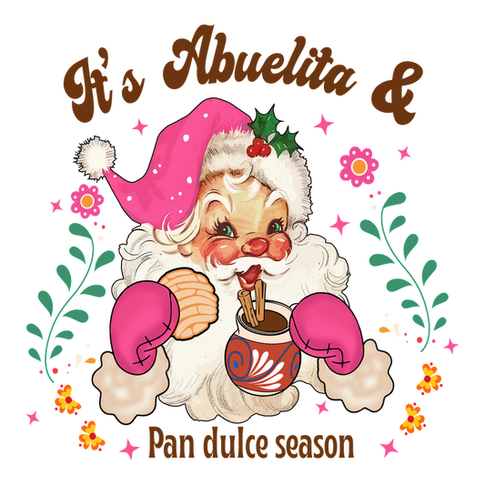 Celebrate the holiday spirit with this adorable illustration of a cheerful Santa-style abuelita, embracing the sweet "Pan Dulce" season!DTF Transfersdtf regular iron dtf prints