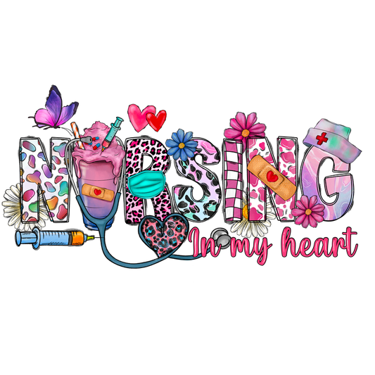 A vibrant and playful design featuring the word "NURSING" adorned with hearts, flowers, and nursing-related elements, reflecting a passion for healthcare.DTF Transfersdtf regular iron