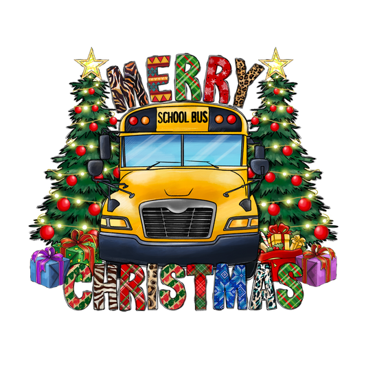 Celebrate the holiday spirit with this cheerful illustration featuring a bright yellow school bus, decorated Christmas trees, and vibrant gifts!DTF Transfers heat press transfers dtf prints