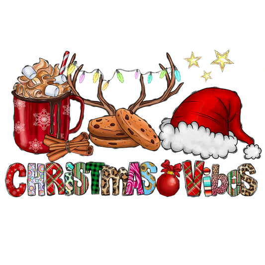 Get into the festive spirit with this cheerful illustration featuring hot chocolate, cookies, reindeer antlers, and vibrant holiday vibes!DTF Transfers heat press transfers