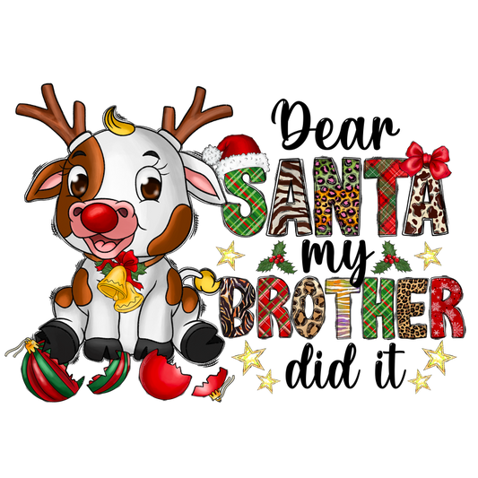 A cute cartoon cow wearing a Santa hat and bell, surrounded by festive decorations, alongside playful text reading "Santa Brother."DTF Transfers dtf transfers heat press transfers