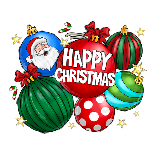A cheerful illustration featuring colorful Christmas ornaments, a jolly Santa, and the festive text "Happy Christmas" surrounded by stars and candy canes.DTF Transfers dtf prints