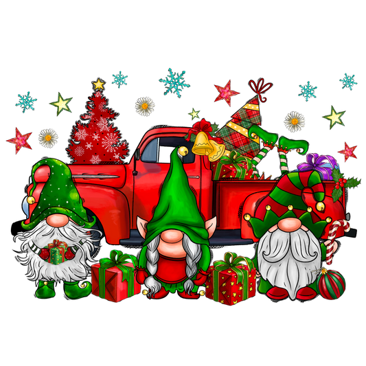 A festive scene featuring three cheerful gnomes in green hats, surrounded by colorful gifts and a vintage red truck adorned with Christmas decorations.DTF Transfers dtf prints
