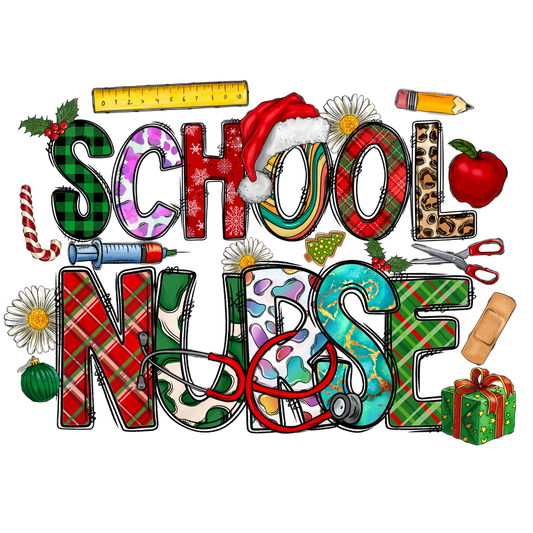 Colorful and festive "School Nurse" design featuring playful letters and school-related icons, perfect for celebrating health and education!DTF Transfersdtf regular iron