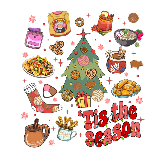 A festive illustration featuring a decorated Christmas tree surrounded by delicious seasonal treats like cookies, nachos, and warm beverages.DTF Transfers heat press transfers heat press transfers